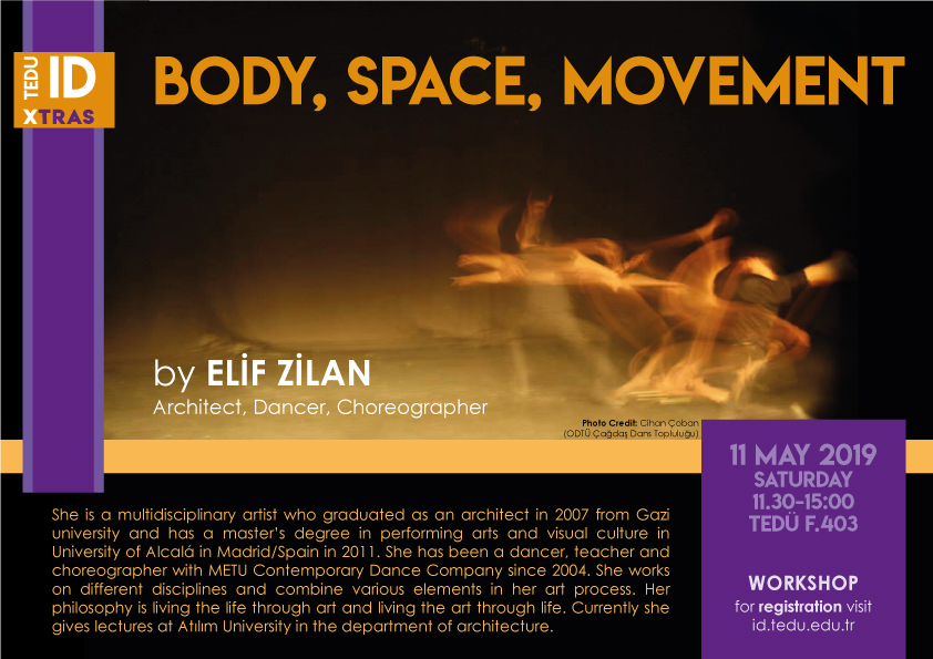 In ID 112 Visual Communication class, a workshop will be held on "Body Space Movement" by Elif Zilan. The workshop is open to undergraduate students from the faculty of architecture.